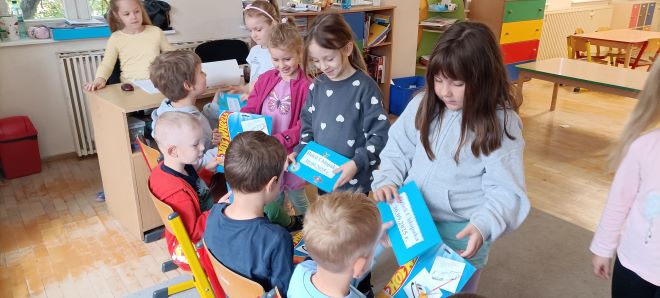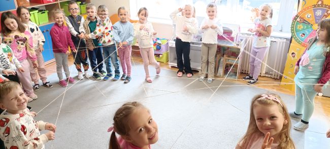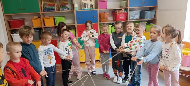 W piątek dzieci uczestniczyły w zajęciach z pedagogiem specjalnym opartych na książce „Co robi Frania? – Współpraca”. Podczas spotkania rozmawiały o tym, jak ważne jest wspólne działanie, pomaganie sobie nawzajem i osiąganie celu razem.